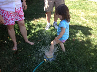 It's strange. She'll scream in the shower if she even thinks water is coming within a foot of her face, but give her a garden sprinkler and she'll soak herself from head to toe. Gleefully.